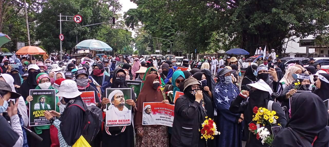 BANDUNG, LENSAJABAR — Pergerakan Islam Indonesia yang tergabung dalam Aliansi Pergerakan Islam (API) mengadakan rapat akbar dalam menyambut kepulangan Imam Besar Front Pembela Islam (FPI) Muhammad Habib Rizieq di depan Gedung Sate Kota Bandung, Jawa Barat. Rabu (4/11).