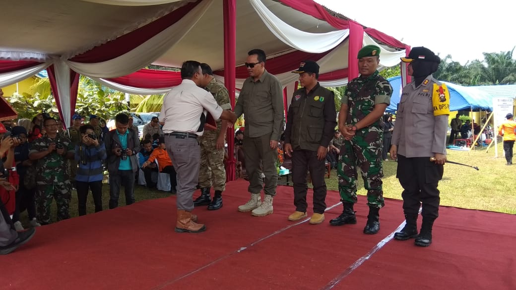 Gelaran Apel Kesiapsiagaan Personil dan Peralatan Penanggulangan Kebakaran Hutan Kebun dan Lahan Kabupaten Muba Tahun 2019, dikumandangkan di Desa Mendis Jaya Kecamatan Bayung Lencir, bersama wakil bupati Musi Banyuasin Beni Hernedi, Ketua DPRD Musi Banyuasin Abusari Kapolres Muba AKBP Andes Purwanti,SE,MM, Dandim O401/Muba Letkol Arm Saifudin Khoiruzzaman,S.sos,Senin (29/7/3019).