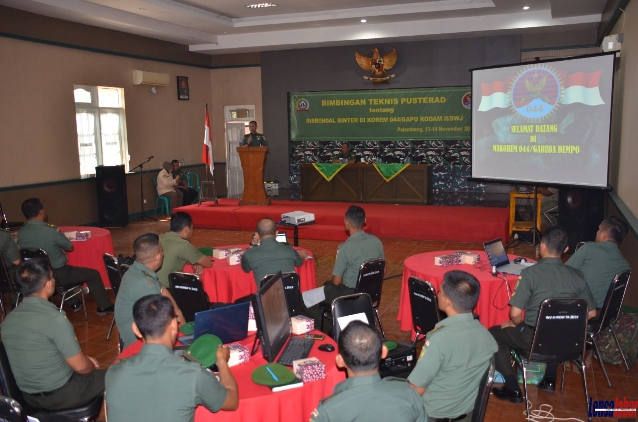 PALEMBANG,LENSASRIWIJAYA.COM – Pada hari ini Rabu(13/11/2019)Tim dari Pusat Teritorial Angkatan Darat yang diketua oleh Letkol Inf Tarmuji.S.Ag dan Mayor inf I Nyoman Satriadi S.E memberikan Bimbingan Teknis Sistem Perencanaan dan Pengendalian (Bimnis Sisrendal) Pembinaan Teritorial (Binter) kepada Aparat Teritorial (Apter) Jajaran Korem 044/Garuda Dempo di Balai Prajurit makorem 044/Gapo,JL.Jend.Sudirman Km 4,5 Palembang.