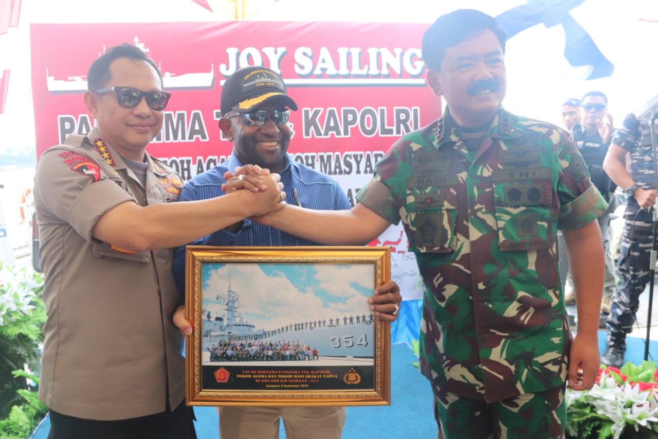 PAPUA,LENSAJABAR.COM -Panglima TNI Marsekal TNI Hadi Tjahjanto, S.I.P. didampingi Kapolri Jenderal Polisi Prof H.M. Tito Karnavian, P.hD., bersama para tokoh Agama, Tokoh Adat, Tokoh Masyarakat dan Forkopimda Papua, berlayar mengarungi laut Papua dengan menggunakan KRI Oswald Siahaan-354, Jumat (6/9/2019).