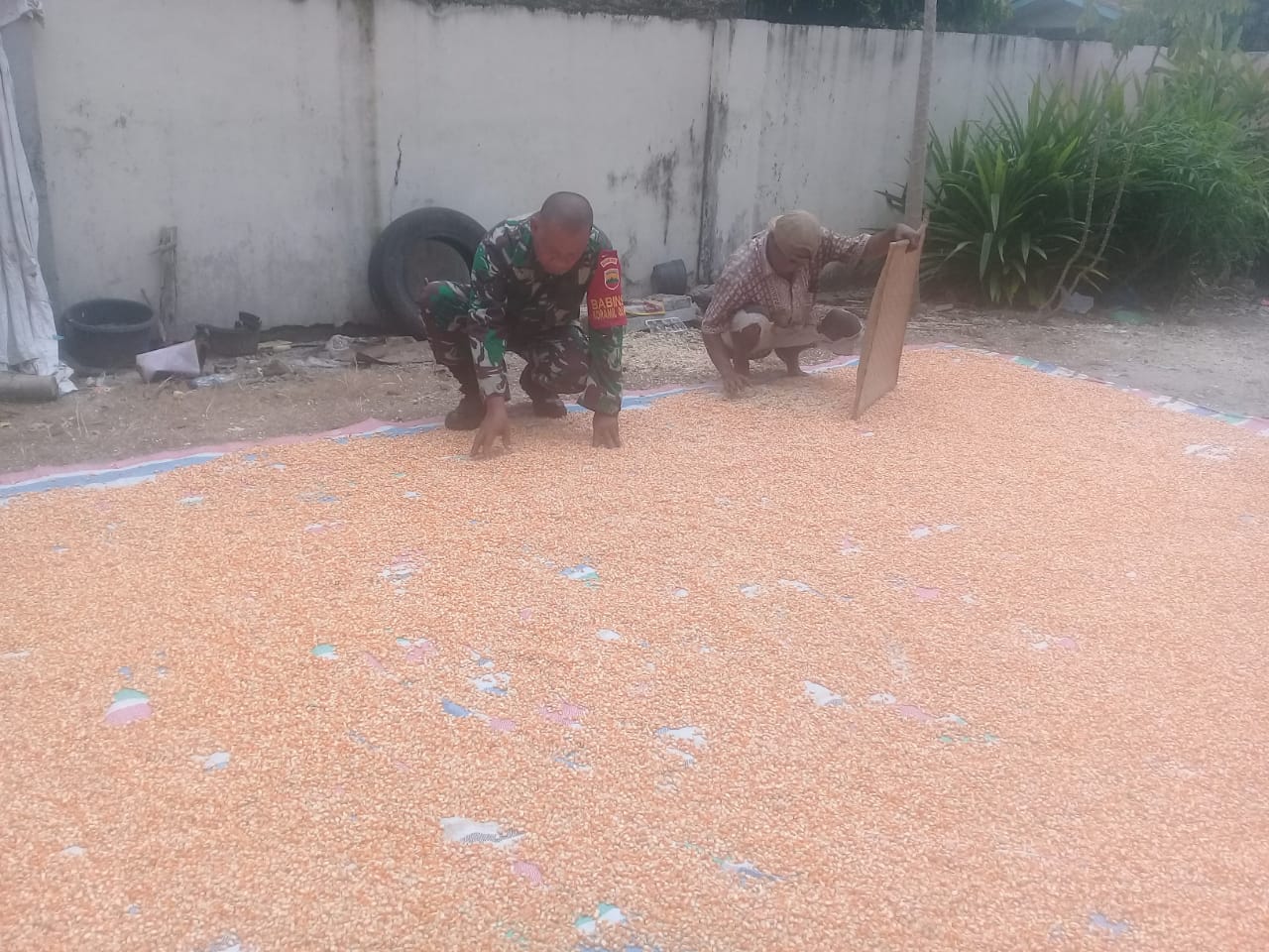 Pantauan dilokasi Serda Ramlan menjemur jagung diatas lantai yang telah biasa digunakan saat menjemur padi.