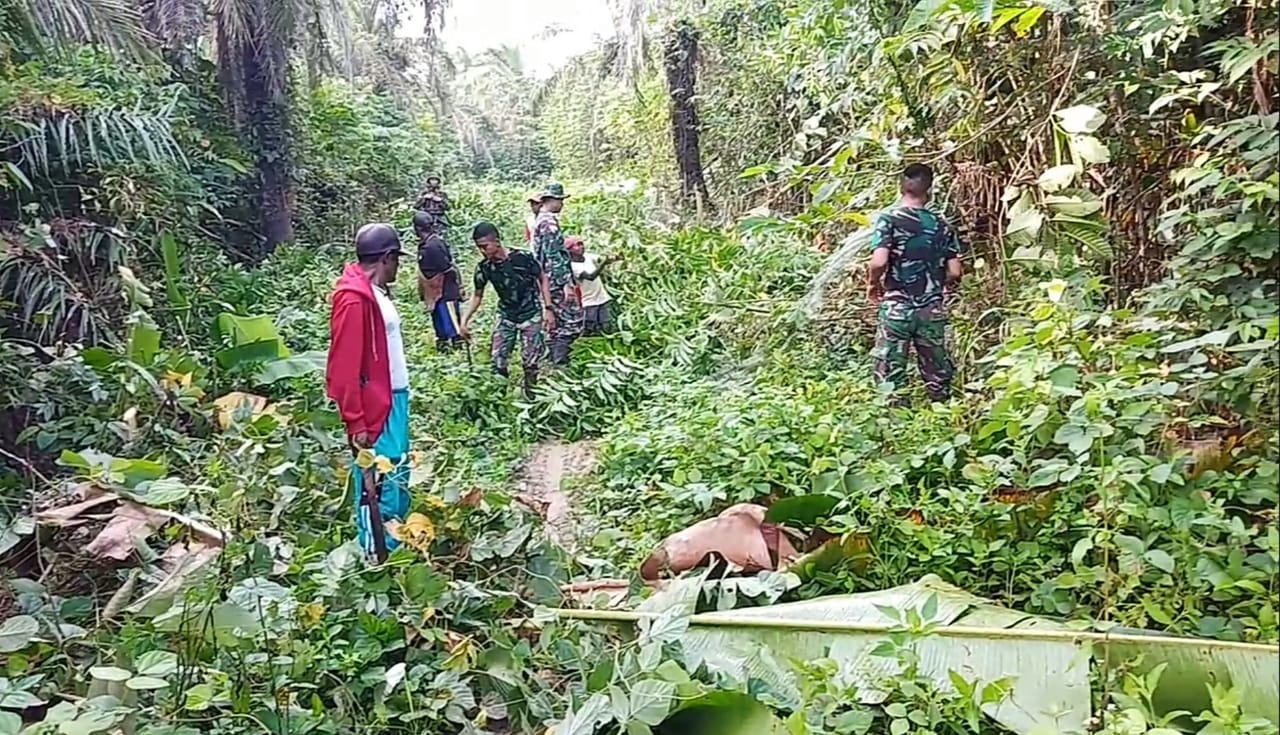 Prajurit Satgas Pamtas Yonif 126/KC yang dipimpin Komandan Pos Sertu Khairizal beserta 10 orang dengan membawa parang, Mesin babat rumput dan sapu langsung turun ke lokasi bersama masyarakat untuk membersihkan rumput liar dan semak di sepanjang jalan.